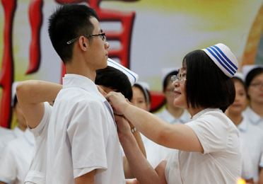 前辈为毕业学生佩戴校徽-神圣的托付 (供稿人:刘华平) |