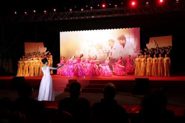 初冬的夜晚,凉风习习,露天舞台上医大学生雨燕合唱团、退休老同志协和音合唱团及京内各所院等近500名演员,用他们的演唱热情、高亢嘹亮的歌声伴着优美的舞姿驱赶着寒冷,热烈的演出场面,庞大的演员阵容和京外单位送来的祝福为庆典盛会献上一份饕餮大餐,感染了现场每一位观众。
