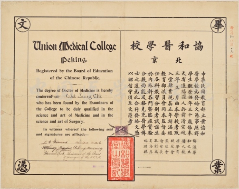 (我校前身协和医学堂1916届魏荣祺毕业证书。北京市退休教师魏德纯于2020年6月2日主动捐赠,特别致谢!)
