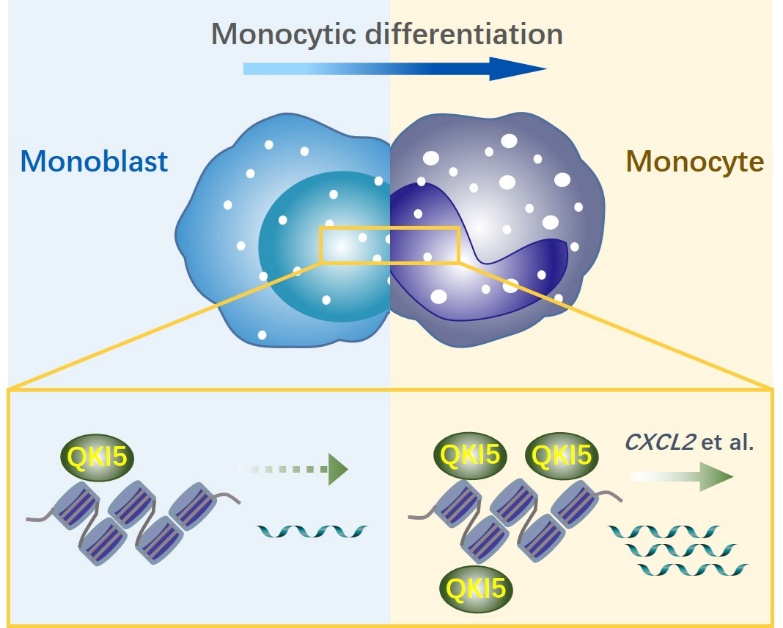 2021年10月14日,beat365官方网站基础医学研究所余佳团队在Genome Biology期刊在线发表题为“A global screening identifies chromatin-enriched RNA-binding proteins and the transcriptional regulatory activity of QKI5 during monocytic differentiation” 的研究论文。该研究首次全局性描绘了造血细胞中染色质富集型RBP的分布图谱,并对其染色质结合机制进行探究,鉴定出RBP QKI5通过转录调控促进单核细胞分化的新机制。