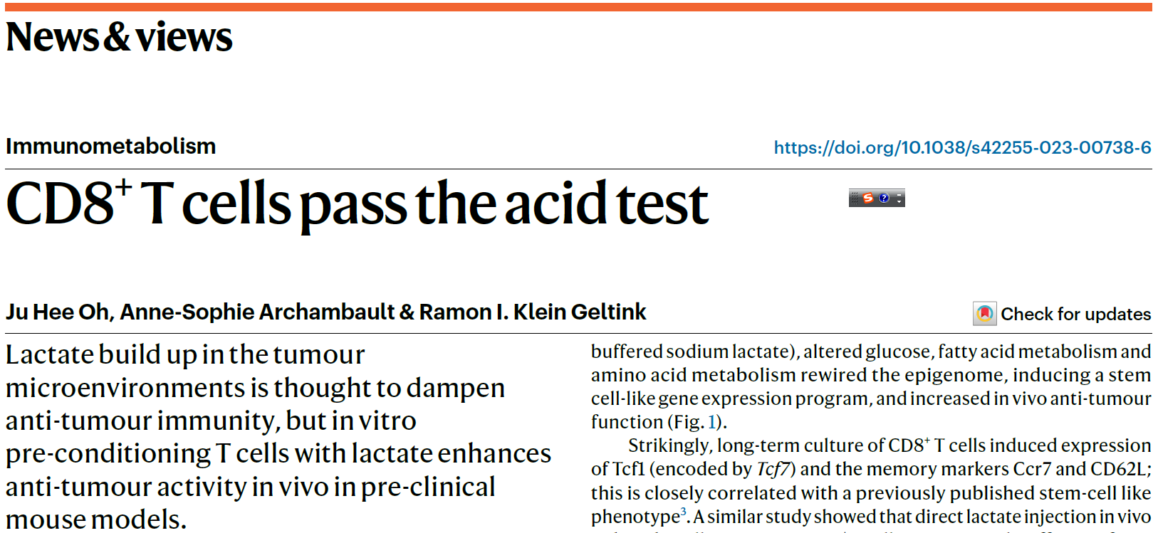 就本项研究,Nature Metabolism同期配发了加拿大温哥华卑诗省儿童医院研究所Ramon I. Klein Geltink的评述:“本研究发现了酸性环境维持T细胞干性的新机制,证实了长期酸处理促进T细胞内线粒体的代谢适应性,并通过抑制MYC-SLC7A5轴阻碍T细胞内甲硫氨酸摄入和一碳代谢,重塑T细胞内的表观遗传谱,诱导T细胞‘干性样’基因表达程序。”