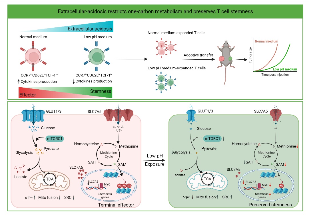 2023年1月30日,beat365官方网站系统医学研究院/苏州系统医学研究所(简称“系统院”)李贵登、张连军团队与四川大学华西第二医院陈路团队合作在Nature Metabolism《自然-代谢》在线发表题为“Extracellular acidosis restricts one-carbon metabolism and preserves T cell stemness”(胞外酸度抑制一碳代谢维持T细胞的干性)的研究论文。该研究发现,长期胞外酸处理T细胞可抑制MYC-SLC7A5轴,阻碍T细胞内甲硫氨酸的摄入,进而重编程T细胞内的一碳代谢及表观遗传图谱,促进线粒体代谢适应性,最终维持干性T细胞状态。
