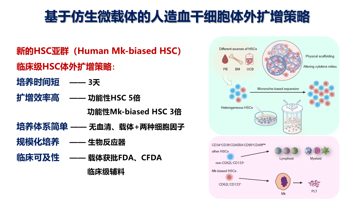 该研究制作了在刚性、孔径、材料等方面模仿骨髓微环境的仿生微载体,将之添加到细胞培养体系中,发现该体系能以多种来源细胞为原料,扩增较原始的造血干细胞(HSC)亚群。通过极限稀释移植实验得出,微载体将功能性造血干细胞扩增了5.01倍。在生物反应器内应用该扩增策略后,实现了脐带血单核细胞(UCB MNC)为起始细胞的HSC体外规模化扩增,功能性干细胞扩增达7.39倍。