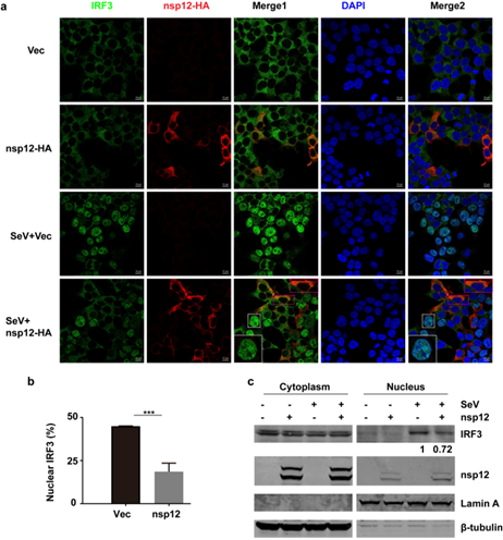 前期病原生物学研究所王健伟课题组在Nature Communications发表的研究初步阐明新型冠状病毒天然免疫逃逸机制的研究,报道了SARS-CoV-2感染进程中的干扰素反应,系统筛选了病毒编码蛋白对于干扰素产生和下游信号通路的影响。本研究在之前筛选的23个SARS-CoV-2编码蛋白对于I型干扰素产生影响的基础上,进一步对SARS-CoV-2的聚合酶nsp12拮抗I型干扰素的作用及机制进行了深入研究,并于2021年2月26日在Cellular & Molecular Immunology杂志发表题为《SARS-CoV-2 nsp12 attenuates type I interferon production by inhibiting IRF3 nuclear translocation》的论文。该研究发现nsp12可以抑制仙台病毒和poly(I:C)介导的I型干扰素的产生,而对于干扰素下游信号通路则无抑制作用。nsp12作用于重要转录因子IRF3的下游,但并不影响IRF3的磷酸化,而是通过抑制IRF3的核转移从而抑制I型干扰素的产生。最后通过突变,发现nsp12聚合酶活性位点突变体仍然可以抑制IRF3的核转移,进而抑制I型干扰素的产生,说明nsp12拮抗I型干扰素产生的作用与其聚合酶活性无关。
