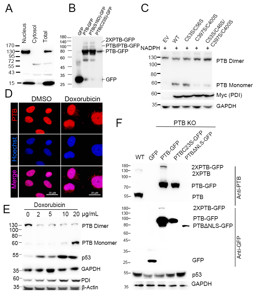 本研究团队首次发现PTB在细胞核和细胞质中分别形成二聚体和单体,并将介导二聚体形成的氨基酸定位到第23位半胱氨酸;分子内或分子间半胱氨酸之间形成二硫键是最常见的蛋白质多聚体形成机制,这个过程主要是由硫氧还蛋白(thioredoxin,TRX)超家族催化。研究团队对该家族的成员进行筛选后,发现蛋白质二硫键异构酶(protein disulfide isomerase,PDI)是调控PTB去二聚化的关键分子,并在DNA损伤模型中得到证实;进一步探讨了DNA损伤应答中PTB去二聚化后的功能和机制,发现细胞质中的PTB单体能够促进p53的翻译,免疫沉淀和质谱鉴定结果提示这种作用可能是通过增加TP53 mRNA与翻译机器的相互作用来实现的。本研究揭示了RNA结合蛋白多聚体和单体的相互转换能够影响其亚细胞定位,进而对下游基因的翻译进行调控,扩展了对RNA结合蛋白作用机制的认识。
