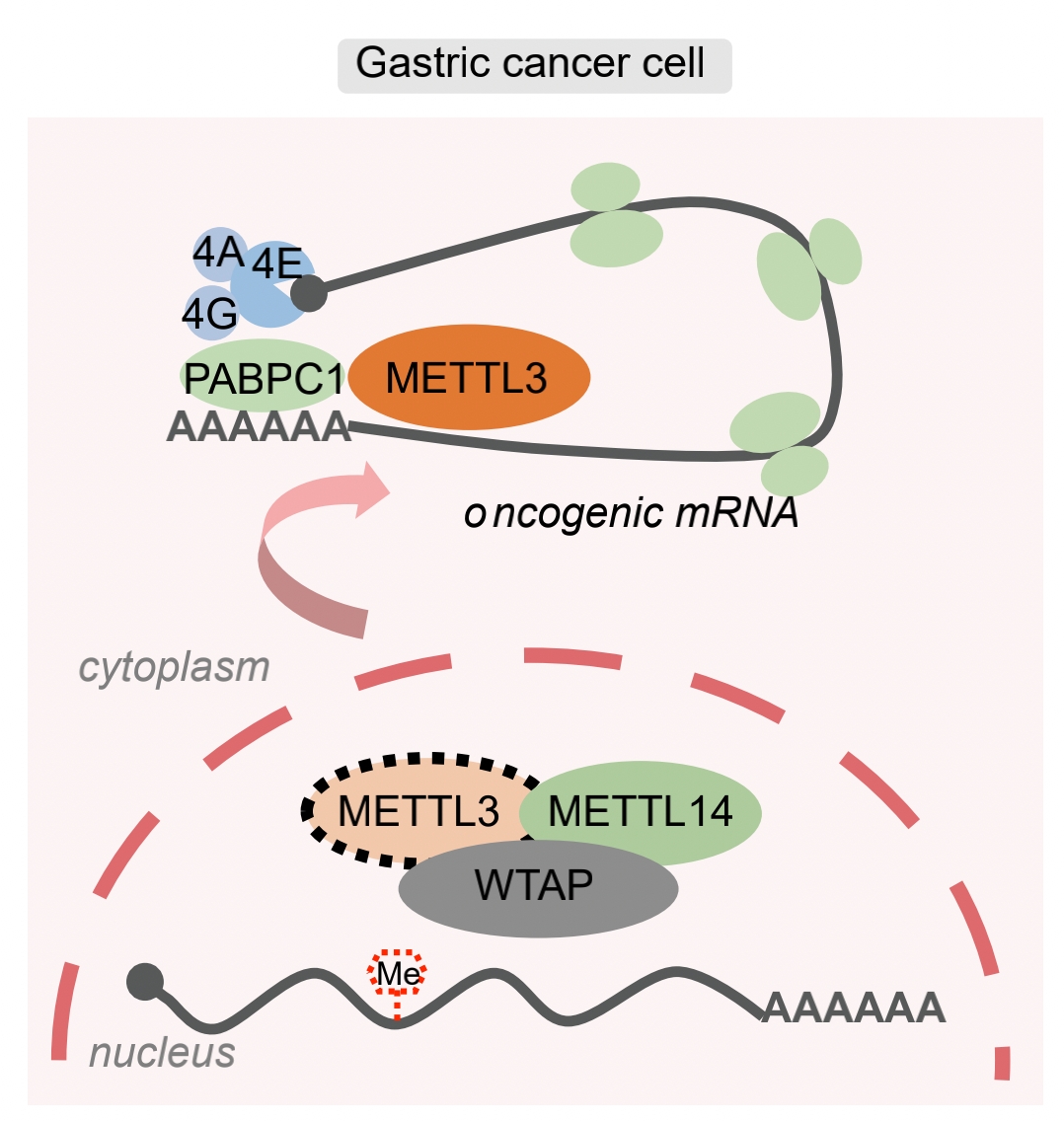 本研究揭示了METTL3不依赖于m6A的新型、非经典调控机制,丰富了对RNA甲基化关键分子METTL3的全面认识;更重要的是,我们发现在包括胃癌在内的多种肿瘤中,细胞质中的METTL3丰度与患者生存期密切相关。因此,在这些肿瘤中,抑制METTL3或METTL3-PABPC1互作代表了比靶向其甲基转移酶活性更有前途的治疗方法。