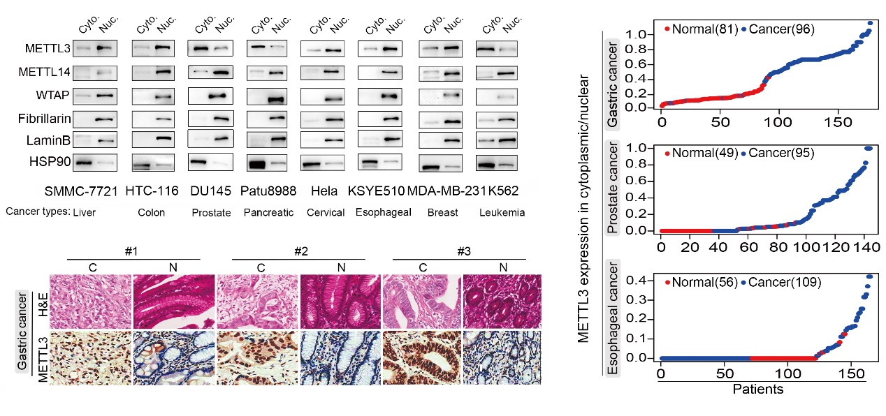 本研究团队在METTL3的亚细胞定位筛查中发现,不同于大多数情况METTL3与METTL14、WTAP共定位于细胞核(三者组成甲基转移酶复合体MTase,负责催化m6A修饰的产生),在胃癌、前列腺癌、胰腺癌、白血病中,METTL3特异性富集在肿瘤细胞的细胞质中。并且METTL3在细胞质的富集程度与肿瘤进展密切相关,其中以胃癌最为显著(图1)。后续的功能实验证实,胞质特异性表达在的METTL3确实能够促进胃癌的发生发展。