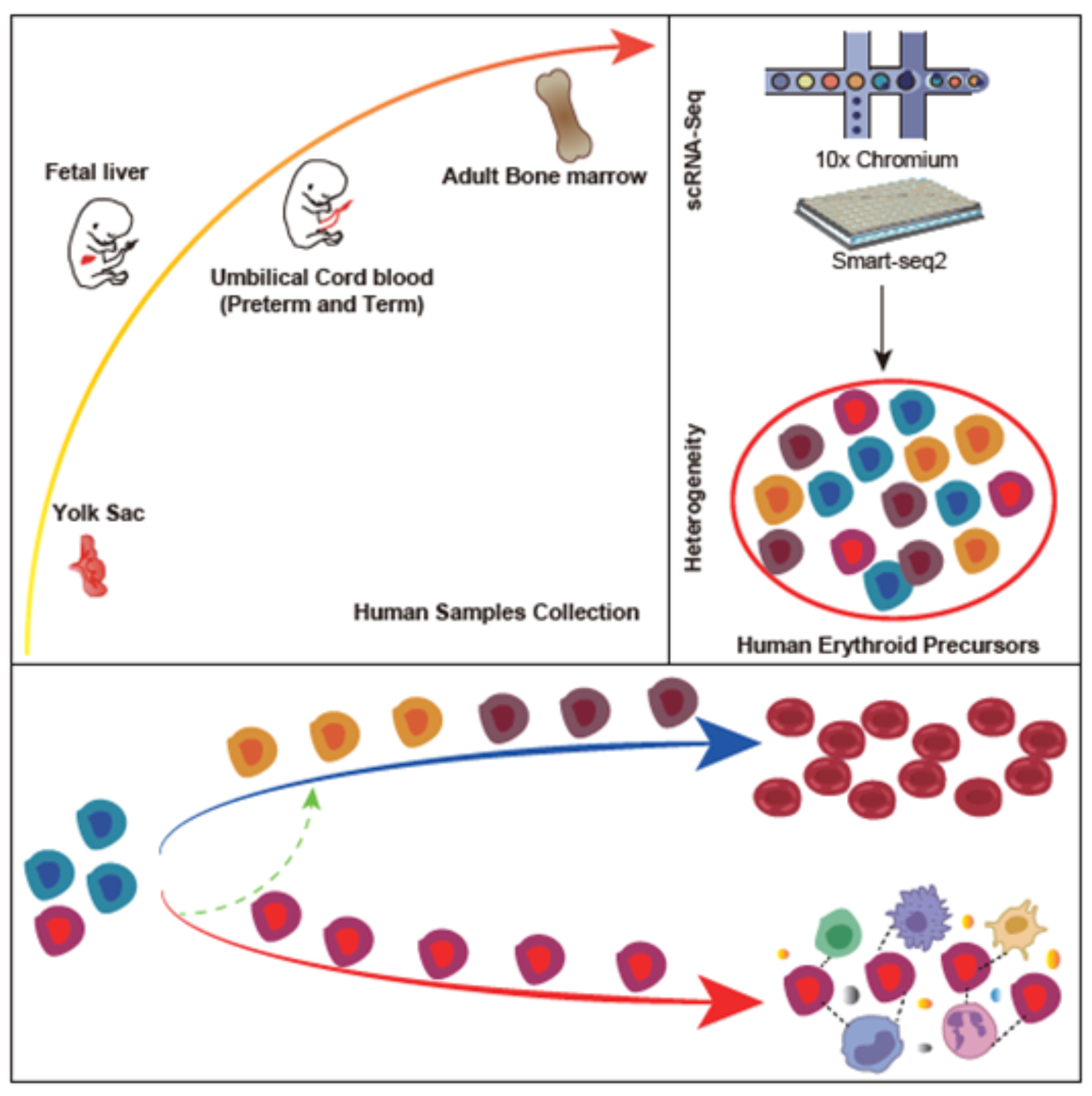 红细胞作为机体数量最多的血细胞,也是最早出现的血细胞之一,其所承载的携氧功能对人体健康和生命维持至关重要,并伴随机体造血发育的全过程。尽管长久以来红细胞一直被认为是均质的携氧细胞,近年来的一些研究提示红细胞具有一定的免疫调控特征,此外,还有研究表明病理状态下的红细胞同样发挥免疫调控功能,在疾病的进展中发挥重要作用,但红细胞免疫调控是所有红细胞兼而有之还是部分红细胞所特有,即红细胞是否具有功能异质性,仍是领域的前沿科学问题。该科学问题的解析依赖于我们对单个红细胞分子特征的全面认知。但由于技术的局限,人早期胚胎发育红细胞的研究止步于形态学描述,其分子特征、群体组成及功能异质性等知之甚少,严重制约了对红细胞新功能的探索。
