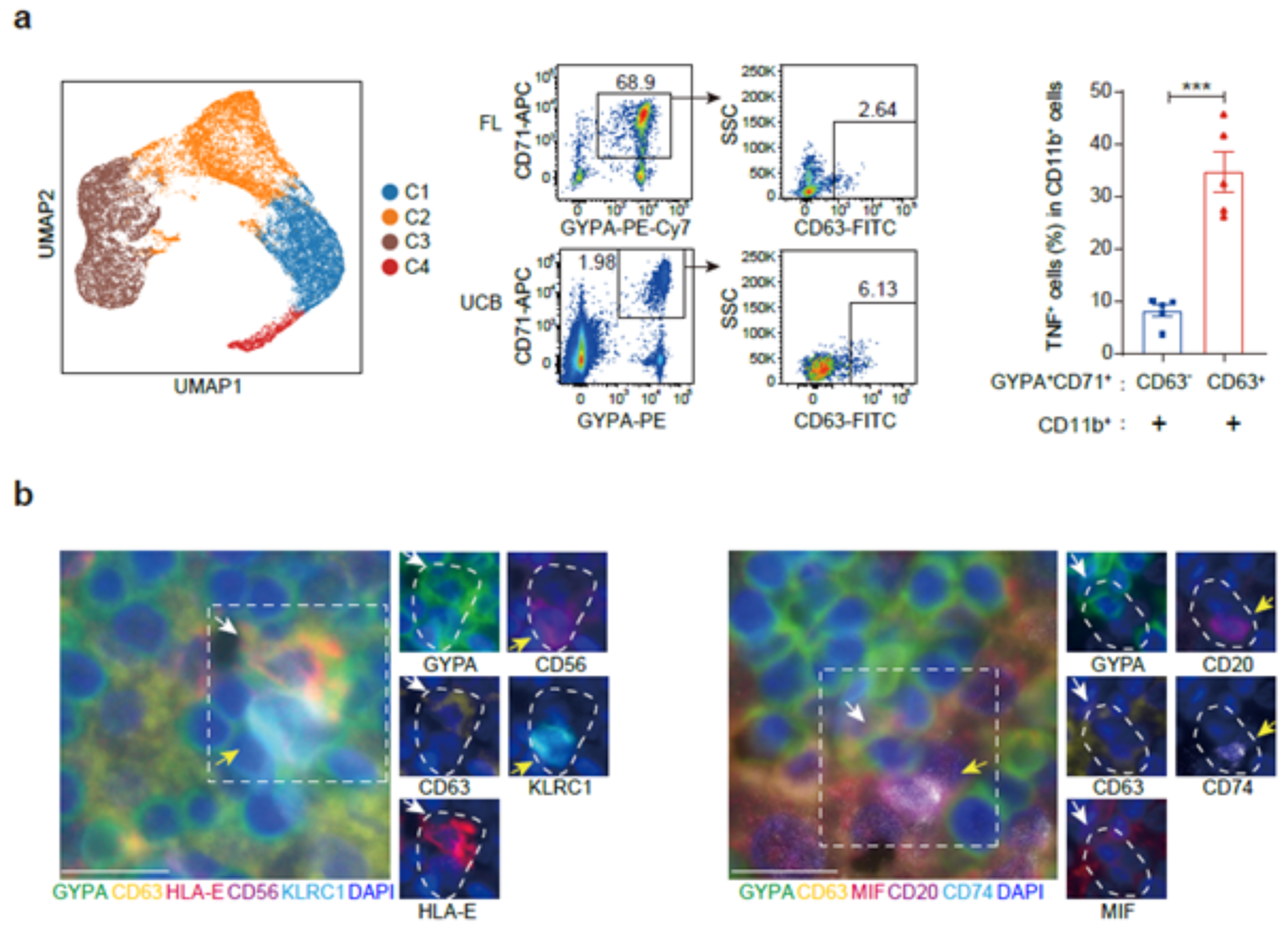随后,研究人员将重点聚焦在上述发现的免疫调控红细胞亚群,时序分析发现该亚群具有与经典红细胞不同的分化路径。通过计算,研究人员筛选到免疫调控红细胞亚群中特异性高表达的表面标志CD63,并在人胎肝组织原位检测到CD63表达的有核红细胞。为了进一步探究该细胞亚群的功能,研究人员从人胎肝、脐带血及成年骨髓多个位点分选出表达CD63的有核红细胞亚群,并将其与不同的免疫细胞群体共孵育,发现其显著促进了免疫细胞中炎症因子的分泌,证明了该亚群的具有免疫调控功能。细胞间互作(受配体对)分析还发现,与经典有核红细胞相比,免疫调控红细胞与各种免疫细胞之间存在更广泛、更强的潜在相互作用。机制分析发现,免疫调控红细胞还兼容了红细胞与免疫细胞两套转录调控。总之,这些结果证明了免疫调控红细胞亚群的调控功能,并提供了免疫调控红细胞调控免疫细胞的分子基础。