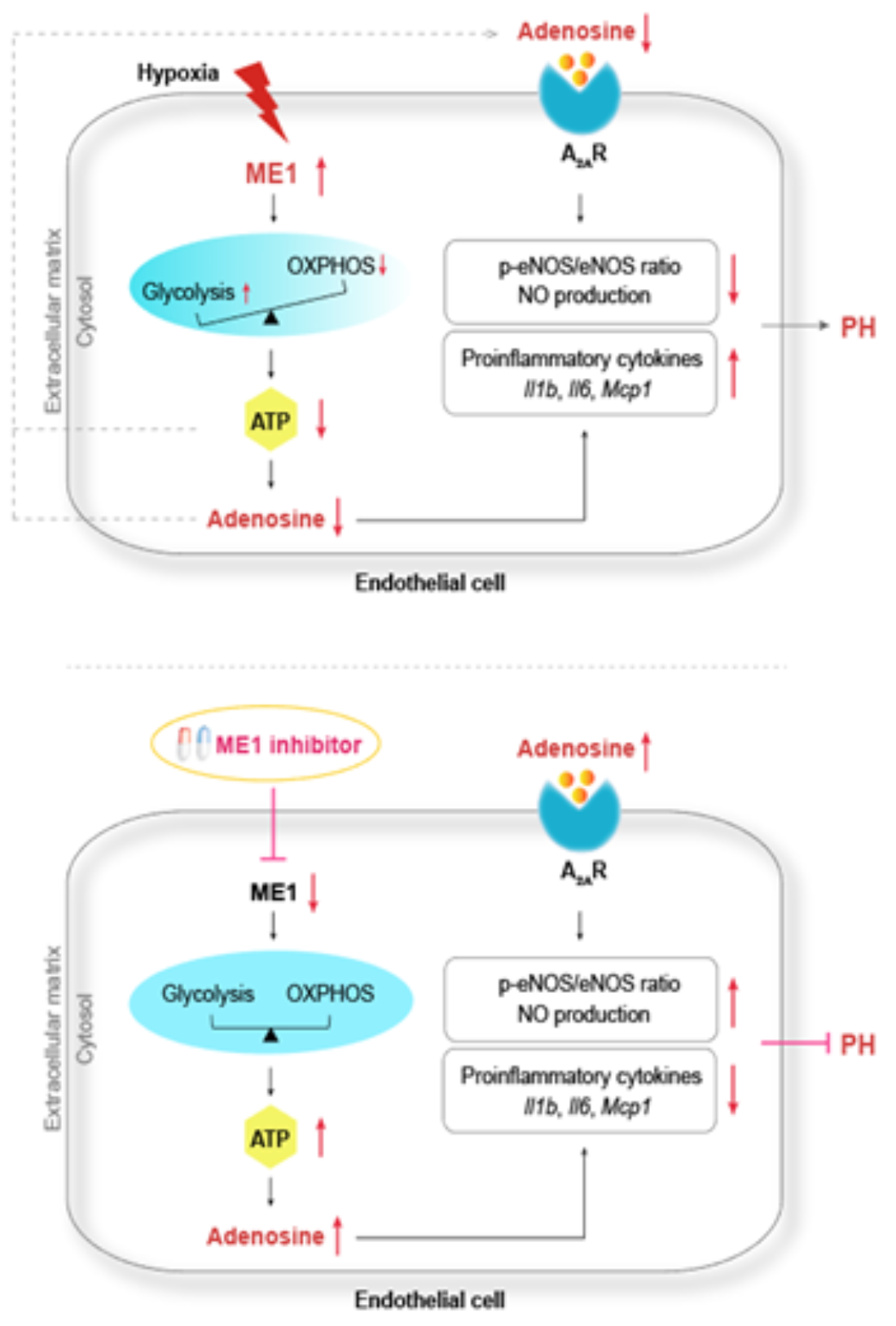 该研究关注了ME1,它是连接糖酵解和三羧酸循环的关键酶。研究发现,在PH患者和小鼠的肺组织中,ME1蛋白水平和酶活性升高,主要是在血管内皮细胞中。内皮特异性ME1缺失减轻了PH小鼠肺血管重塑和肺动脉高压。ME1抑制促进了内皮细胞中腺苷的产生并激活了腺苷信号转导,从而导致一氧化氮生成的增加和促炎分子表达的减少。抑制ME1通过调节线粒体苹果酸-天冬氨酸-还原型辅酶Ⅰ(Nicotinamide adenine dinucleotide, NADH)穿梭,从而平衡氧化磷酸化和糖酵解,以三磷酸腺苷(Adenosine Triphosphate, ATP)依赖性方式激活腺苷的产生。通过促进体内腺苷的产生,利用小分子抑制剂抑制ME1可减轻PH的进展。综上,ME1在肺血管内皮细胞中的上调通过负向调节腺苷的产生,进而导致内皮功能失调,在PH的发展过程中起到了重要作用。研究提示在PH治疗上,抑制ME1可作为上调保护性腺苷信号的新型药理学靶点。抑制ME1改善肺动脉高压的相关国内专利已授权。