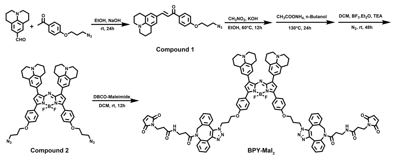 自白蛋白紫杉醇(Abraxane)在临床成功应用以来,基于HSA的药物递送系统因其具有优异的生物相容性和药动学性质,已被广泛应用于肿瘤靶向药物递送。尽管目前已经报道了许多基于HSA的药物递送系统,这些系统仍然存在药物负载率低(低于10%)、制备工艺复杂等问题。因此,开发兼具高药物负载率和高药物递送效率的HSA体系制备技术仍然具有挑战性。在本研究中,该团队报道了一种新型HSA制剂的制备技术,用于负载具有双马来酰亚胺结构的NIR染料BPY(本研究合成的具有光热活性BODIPY类小分子BPY-Mal2,见图1)。该制备技术首先通过TCEP[三(2-羧乙基)膦,一种二硫键还原剂]将链接HSA的二硫键剪开,使得HSA失去三级结构变为肽链。随后,再利用马来酰亚胺和巯基的反应负载BPY,将BPY桥接在肽链之间,通过药物与肽链之间的交联形成自组装纳米粒(图2)。相比于之前报道的HSA药物递送体系,该技术所制备的BPY@HSA显著提高了药物负载率(26.1%),并在体外表现出了增强的细胞摄取和3D肿瘤球渗透能力。这是由于改性后的HSA不仅能与gp60结合,还能与gp18和gp30等受体结合,这提高了肿瘤细胞对BPY@HSA的主动摄取效率。体内研究亦表明该体系具有良好的靶向效率,可作为一种新型光热治疗体系用于光热消融肿瘤。