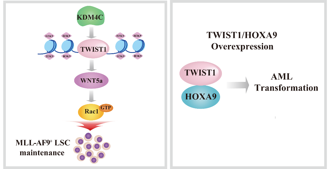 该研究证实TWIST1在MLL-AF9 LSC中具有极高的表达水平,且它的高表达是由KDM4C基因通过降低组蛋白H3赖氨酸9三甲基化修饰(H3K9me3)水平所调控。TWIST1是LSC维持存活、静息态和自我更新能力所必需的,促进MLL-AF9融合蛋白介导的AML的发生和进展。随后,该研究通过质谱分析、免疫共沉淀以及GST pull-down实验首次报道TWIST1和HOXA9存在直接相互作用,并共同诱导急性髓系白血病发生。最后,该研究利用转录组测序证实TWIST1通过直接转录激活WNT5a/RAC1通路来调控LSC功能。该研究有助于深入理解MLL-AF9 AML发病机制,为发现新的临床治疗靶点提供重要理论依据。