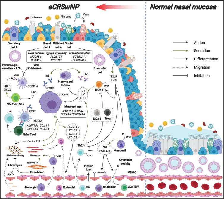 本研究通过单细胞转录组测序技术建立了正常人、慢性鼻窦炎不伴鼻息肉、嗜酸性慢性鼻窦炎伴鼻息肉以及非嗜酸性慢性鼻窦炎伴鼻息肉3种CRS亚型患者的鼻腔黏膜免疫和非免疫细胞的单细胞图谱,并对影响慢性鼻窦炎病程发生发展和亚型分化的内在分子机制进行了研究,系统定义了在eCRSwNP中影响病程进展的局部组织微环境内的关键因素,一是基底细胞的过度增生异常分化及保护性细胞分子的缺失,导致屏障功能受损;二是胞外基质重塑和成纤维细胞、巨噬细胞、血管内皮细胞、平滑肌细胞等细胞亚群的功能紊乱;三是TH2细胞、ILC2细胞、IL5RA+浆细胞、细胞毒性CX3CR1+CD8+TEFF细胞和NK细胞增加并伴随CD8+TRM细胞缺失;四是NK-cDC1 免疫监视轴功能丧失和ALOX15+ cDC2-TH2交互作用轴功能的过度激活;五是ALOX15+巨噬细胞的富集,并作为主要的趋化效应细胞,促进炎症相关细胞的浸润,从而驱动2型免疫反应发生(见图1)。