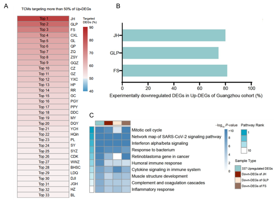A.33种靶向50%以上新冠上调基因的中药饮片。B, C.橘红、瓜蒌皮、佛手中sRNA基因表达调节作用。