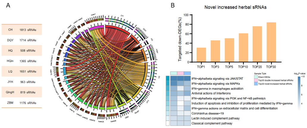 本研究发现,上千条透解祛瘟颗粒来源的sRNA在服药治疗后大量存在于患者的血细胞中。同时经预测分析,发现这些sRNA可靶向患者治疗过程中约80%的下调差异表达基因。通路富集分析结果表明sRNA的预测靶点均聚类到炎症反应,抗病毒免疫反应与补体通路等。中药sRNA与患者治疗过程中的基因表达调节密切相关。