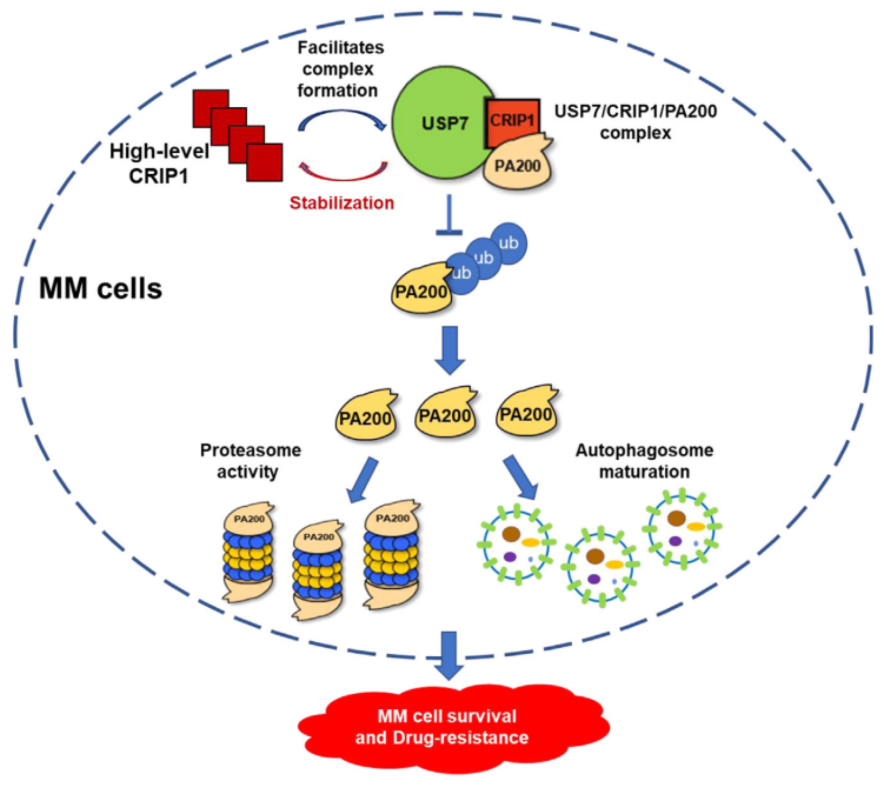 该研究发现CRIP1在MM细胞,尤其是复发/难治性MM细胞中表达升高,且MM细胞中CRIP1高表达与患者不良预后显著相关。CRIP1基因敲除显著抑制了MM细胞的生长、侵袭和迁移,增加MM细胞对PIs诱导的细胞生长阻滞的敏感性,同时基因敲除的MM细胞蛋白酶体活性和自噬活性均显著降低。通过蛋白质谱和Co-IP分析,发现CRIP1可与去泛素化酶USP7及蛋白酶体亚基PA200形成复合物,一方面稳定CRIP1在MM细胞内高水平表达,另一方面有利于USP7与PA200的相互作用,促进USP7介导的PA200去泛素化并增强其稳定性,从而促进MM细胞的存活和耐药。此外,在CRIP1过表达的MM细胞系中分别敲低USP7或PA200基因,会显著抑制MM细胞蛋白酶体活性以及自噬活性,从而增强MM细胞对PIs的敏感性。综上,该研究首次揭示支架蛋白CRIP1通过多途径调控多发性骨髓瘤细胞蛋白质稳态,促进肿瘤细胞耐药性的产生和疾病进展,为发现潜在治疗靶点提供理论依据。