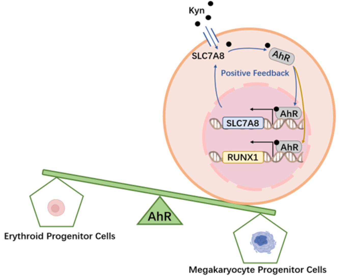 本研究团队在构建的荷瘤小鼠模型中发现其MEP分化异常,且AhR呈现激活状态。分离MEP进行克隆形成(Colony-Forming Units,CFU)实验,发现MEP更多朝巨核细胞分化。敲除AhR的荷瘤小鼠的红细胞和血小板发育分化无异常。本团队之前的研究表明,肿瘤细胞均上调表达吲哚2,3双加氧酶1(Indoleamine 2,3-Dioxygenase,IDO1),该酶催化色氨酸转变为AHR配体Kyn。而在本研究中进一步发现MEP的分化失衡与肿瘤细胞释放到血液中的Kyn相关。MEP的分化受到一系列转录因子的调控。本研究团队发现AhR能结合巨核细胞分化的转录因子RUNX1的启动子并上调RUNX1的表达。另外Kyn的转运子SLC7A8在荷瘤鼠MEP中上调表达,且受到了AhR的正反馈调节。除此以外,本团队在人源化小鼠及白血病病人骨髓和没有肿瘤侵袭的淋巴瘤病人的骨髓中,对Kyn-AhR-RUNX1调控人MEP巨核系分化进行了验证。