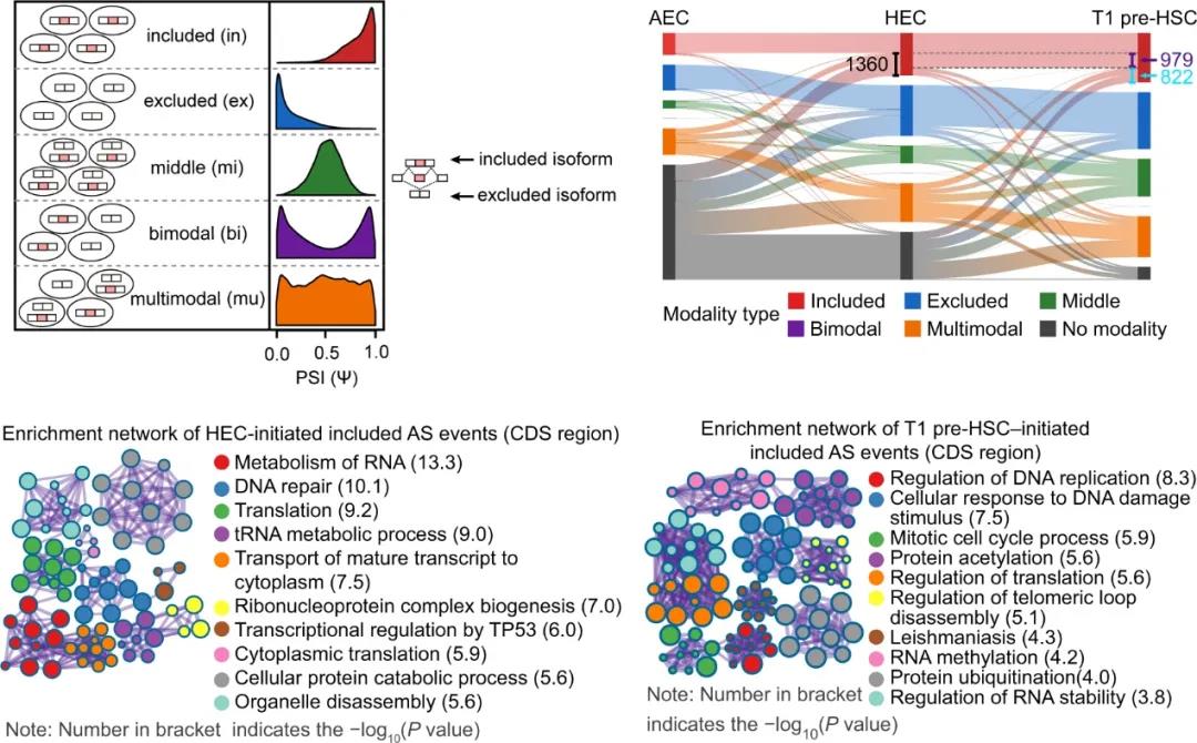 在上述发现基础上,本研究团队进一步从AS角度解析T1 pre-HSC所呈现的最为显著的转录本多样性。在整个EHT过程中,共鉴定出超过一万多个AS事件,并且AS事件的发生频率在T1 pre-HSC阶段达到峰值,与其显著的转录本多样性吻合。借助单细胞测序的优势,研究团队在随后分析中引入“modality”的概念,即:根据AS事件在同一细胞群体内的分布情况将其分为5种模式。本研究有趣地发现,伴随细胞命运从内皮向造血的逐步转换,“included”类型的AS事件也呈现分阶段产生的特征,包括分别鉴定出的979个HEC阶段开始出现的“included”AS事件,以及822个T1 pre-HSC阶段开始出现“included”AS事件。由于上述AS事件均特异性发生在具备造血潜能的细胞群体中,故将其统称为造血细胞特异性“included”AS事件,而这些事件很可能为HSC产生所必需(图2)。