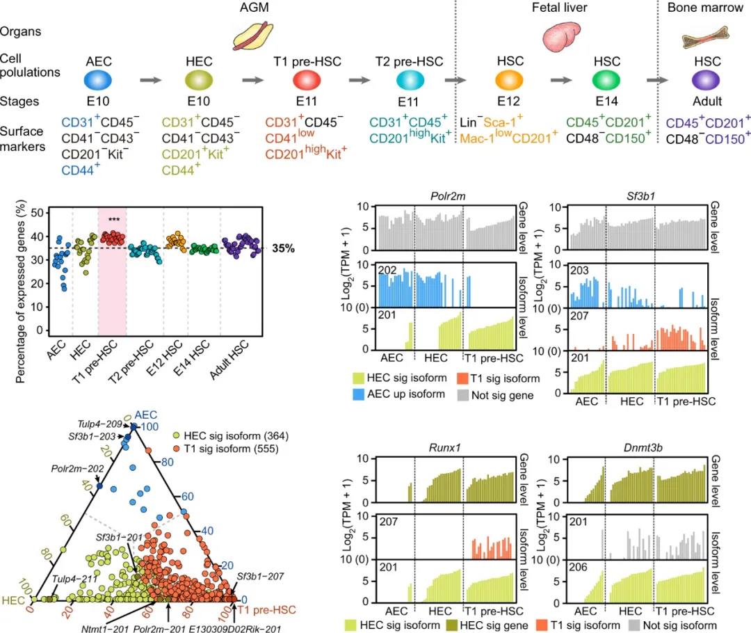 近年来,迫切的临床需求加之体外再生效率低下,使得HSC的高效获取成为最受关注的研究领域之一。HSC发育是一个错综复杂的动态调控网络,关于其胚胎起源的时序特征、发生机制等仍存在诸多未知。精确解析HSC发生的调控规律,是指导体外功能性HSC再生的先决条件。基于单细胞全长转录组测序技术,余佳研究团队构建了基于转录本层面的基因表达图谱,鉴定出一系列生血内皮细胞(hemogenic endothelial cell,HEC)、T1 pre-HSC阶段特异性表达的转录本。值得注意的是,某些基因仅仅呈现某个特殊转录本的造血阶段特异性表达,而这种表达差异在基因层面由于其他转录本干扰被掩盖(图1),提示目前转录组研究以“基因”为中心的分析模式存在不足,而将同一基因的不同转录本纳入分析范畴,将为深入理解和剖析基因功能提供更多参考和依据。