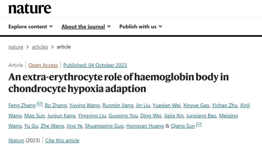 2023年10月4日,beat365官方网站细胞死亡机制创新单元在《自然》在线发表了题为“An extra-erythrocyte role of haemoglobin body in chondrocyte hypoxia adaption”的论文。研究首次报道了软骨细胞在缺氧时产生大量血红蛋白,且在细胞质内形成无膜的血红蛋白小体(Hemoglobin Body, Hedy);在缺氧加剧的情况下,血红蛋白小体释放储存的氧气,以维持软骨细胞的存活和生长板的发育。