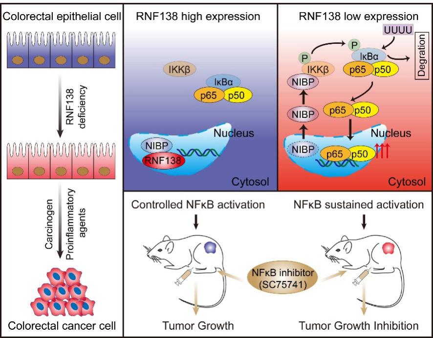 综上所述,本研究以临床问题为切入点,从动物表型、分子机制和临床转化等多个层面系统地阐明了RNF138对结直肠肿瘤发生和发展的调控机制及治疗应用,揭示了该蛋白通过E3非依赖方式促进NIBP胞核-胞浆转运调控NF-κB通路的新机制,并为靶向RNF138低表达型CRC患者的干预和治疗提供了新策略。