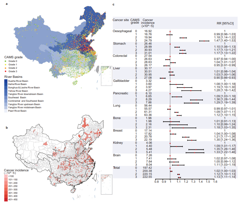 本研究团队首先提出了一种多污染物空间聚集分析(Cluster Analysis of Multi-pollutants in Space,CAMS)方法框架,形成了创新的地表水质分级体系(简称CAMS分级)。CAMS分级综合21种污染物指标水平、空间位置关系及聚集特征,具备灵活、透明、易解读性特点,克服了当前分级标准在健康结局关系量化问题上有效性不足的问题。在此基础上,本研究团队发现多种癌症发病率在不同的CAMS水平上存在近似“剂量-反应”关系,癌种涉及消化系统(食管癌、胃癌、胆囊癌、胰腺癌)及其他系统(肺癌、乳腺癌、肾癌、脑癌、骨癌)。地表水污染物的分布差异在一定程度上可以帮助解释不同流域间的癌症发病水平差异及癌症谱构成差异。本文章还对多污染物风险的综合评估、老龄化的影响等进行了研究。