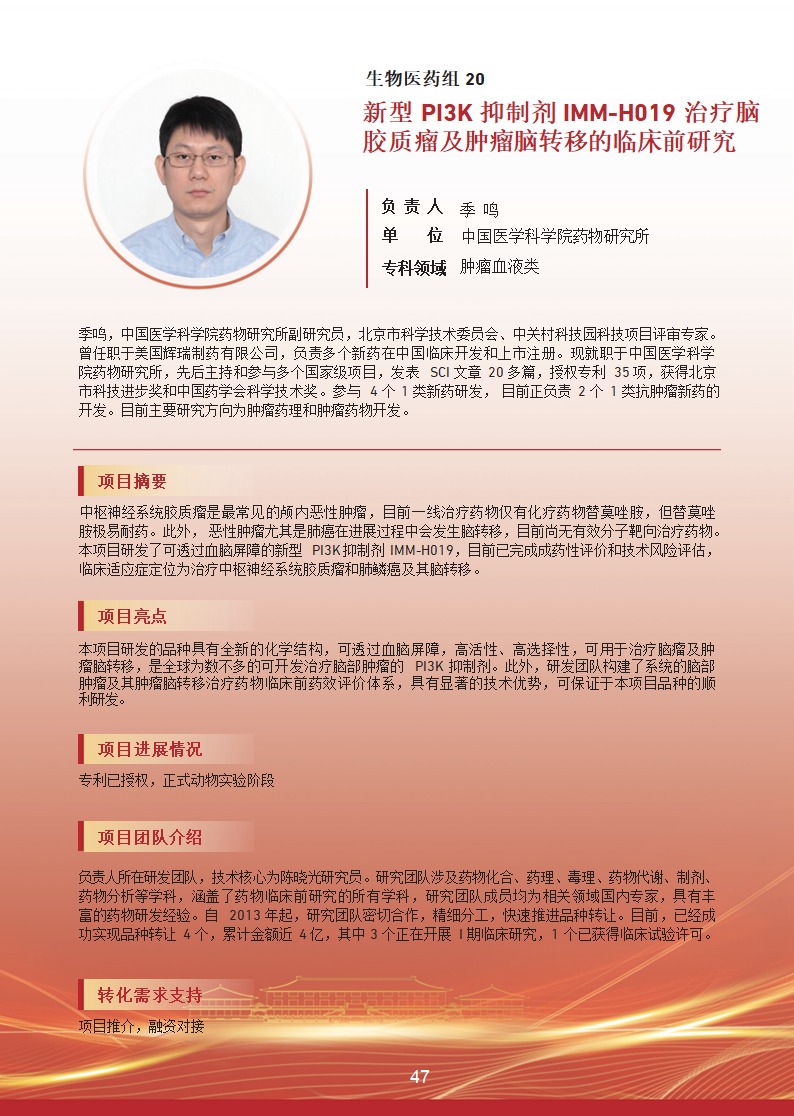 新型 PI3K 抑制剂 IMM-H019 治疗脑胶质瘤及肿瘤脑转移的临床前研究 |