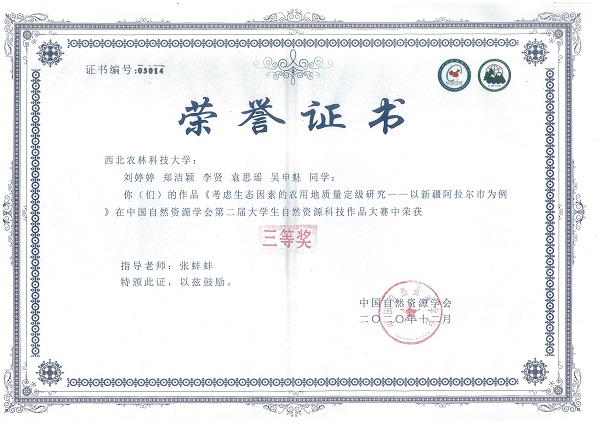 本次大学生自然资源科技作品大赛是由中国自然资源学会主办,中国自然资源学会教育工作委员会、江苏师范大学地理测绘与城乡规划学院、南京大学地理与海洋科学学院、江苏省地理学会和广东国地规划科技股份有限公司承办,旨在加强大学生对我国自然资源的科学认识,鼓励大学生树立人与自然和谐共生的绿色发展理念,调动大学生参与自然资源科技事业的积极性与创造性,提高资源相关专业大学生对资源问题的分析与实践能力,促进不同院校、不同专业方向大学生之间的交流学习,助力资源科技人才的成长与提高。本次比赛中,太阳成集团经管学院2018级本科生刘婷婷、郑洁颖、袁思瑶、李贤、吴申魁在张蚌蚌老师精心指导下,以“考虑生态因素的农用地质量定级研究——以新疆阿拉尔市为例”为主题参赛,取得了三等奖的成绩,展现了太阳成集团土地资源管理专业的教学水平以及各位同学的专业素养。