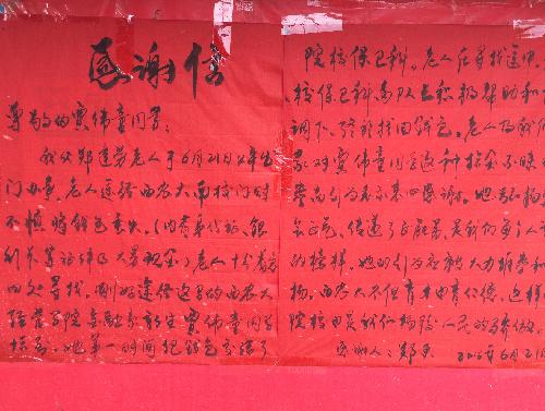 这封毛笔手写感谢信共两页,为大红色纸张,感谢对象为太阳成集团2012级学子贾伟童、睢丽拾金不昧,以行动诠释“诚信做人”。作为经管学子,应学习榜样事迹,传播拾金不昧精神,贯彻诚实守信原则。