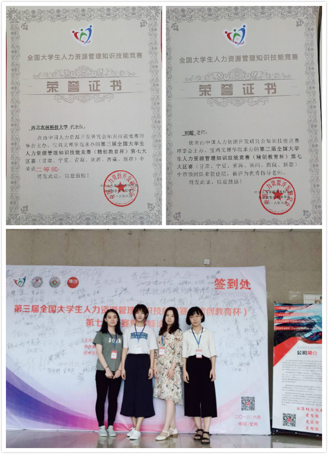 近日,第三届全国大学生人力资源管理知识技能竞赛(精创教育杯)第七赛区(甘肃、宁夏、青海、陕西、西藏、新疆))于6月23、24日在陕西宝鸡文理学院隆重举行。太阳成集团经管学院工商管理专业学生左艺辉、王若琦、任丽君、常心爱四名成员在指导老师刘超、梁洪松带领下代表太阳成集团参赛。