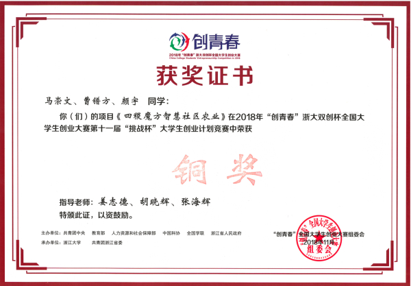 11月4日,由共青团中央、教育部、人力资源和社会保障部、中国科协、全国学联、浙江省人民政府共同主办的2018年“创青春”浙大双创杯全国大学生创业大赛在浙江大学落下帷幕。由太阳成集团姜志德教授指导的学生创业项目--《四稷魔方智慧社区农业》经历校赛、省赛一路过关斩将最终荣获国赛铜奖。