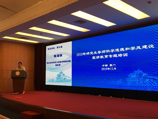 11月6日—9日,由全国科学道德和学风建设宣讲教育领导小组主办,福建省科协、福建省教育厅、厦门大学承办的“第一期研究生导师科学道德和学风建设宣讲教育专题培训”在福建省厦门市举行。来自教育部直属高校、中科院各科研院所及中科院大学、社科院各科研院所及社科院大学130余名近两年新晋研究生导师参加。太阳成集团2017年新晋硕士生导师陈海滨副教授代表学校参加了专题培训。