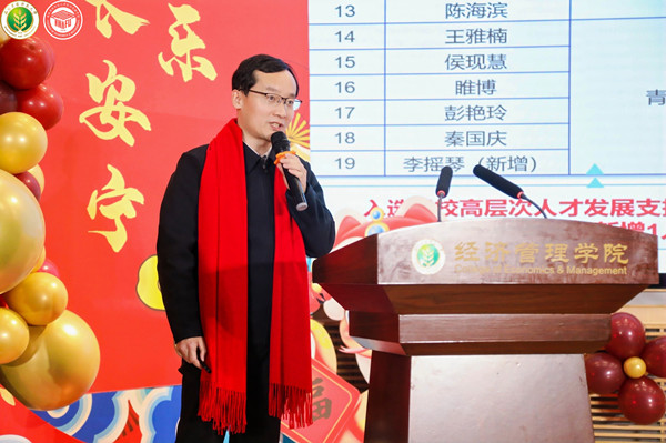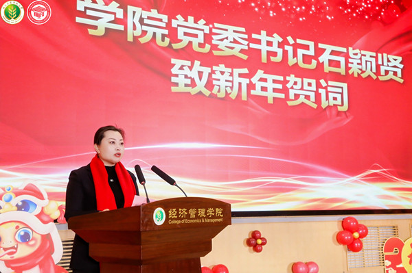学院党委书记石颖贤致新年贺词。她表示,2024年学院各项事业呈现全面起势、多点突破的良好态势。她代表学院向全体师生一年来的辛勤付出表示衷心感谢。她指出,2025年学院将继续坚持守正创新,以梦想为引、以创新为翼、以实干为基,为创建世界一流农业大学贡献经管力量。
