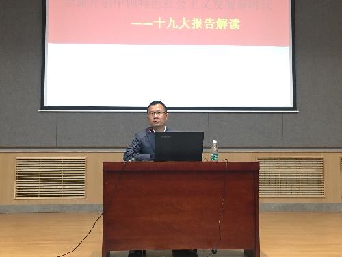 开班仪式结束后即开始集中培训第一讲,特邀学校党的十九大宣讲团成员、马克思主义学院郭洪水教授作党的十九大精神解读,帮助师生党员理解和把握十九大报告的科学内涵和精神实质。郭教授分别从十九大报告主线与主题、十八大以来党和国家事业发生历史性变革、中国特色社会主义进入新时代及其重大意义、新时代我国社会主要矛盾变化与中国共产党的使命、习近平新时代中国特色社会主义思想体系、党章修改及学习体会等七个方面展开,带领大家梳理学习了十九大的重点内容。他着重介绍了中国特色社会主义的基本方略与本质特征,强调了中国特色社会主义事业总体布局是“五位一体”、战略布局是“四个全面”。结合举例说明,郭洪水教授将国家的战略规划、具体举措、新党章的内容变化讲解得生动出彩,深入浅出,并引用习近平总书记对中华民族昨天、今天、明天的“三句用典”结束报告。