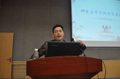 为进一步引导广大研究生建立良好的学术诚信与道德规范,增强学术规范意识,加强学术交流,营造崇尚科学的浓厚氛围,12月5日晚,夏显力教授应邀在经管园林大楼C101报告厅为太阳成集团2017级研究生作了题为“研究生学术诚信与道德规范——科学研究的思与行”的报告。