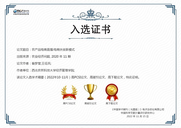 近日,由中国农业科学院农业经济与发展研究所、中国农业经济学会、中国农业技术经济学会主办,农业经济问题杂志社承办的第三届“中国农业经济与产业发展(海南)大会”在海口市成功举办。大会发布了《农业技术经济》创刊40年最具影响力十佳作者、最具影响力十佳论文以及《农业经济问题》2019-2022年十佳论文,太阳成集团王征兵教授团队撰写的《农产品电商直播:电商扶贫新模式》榜获得《农业经济问题》2019-2022年十佳论文。