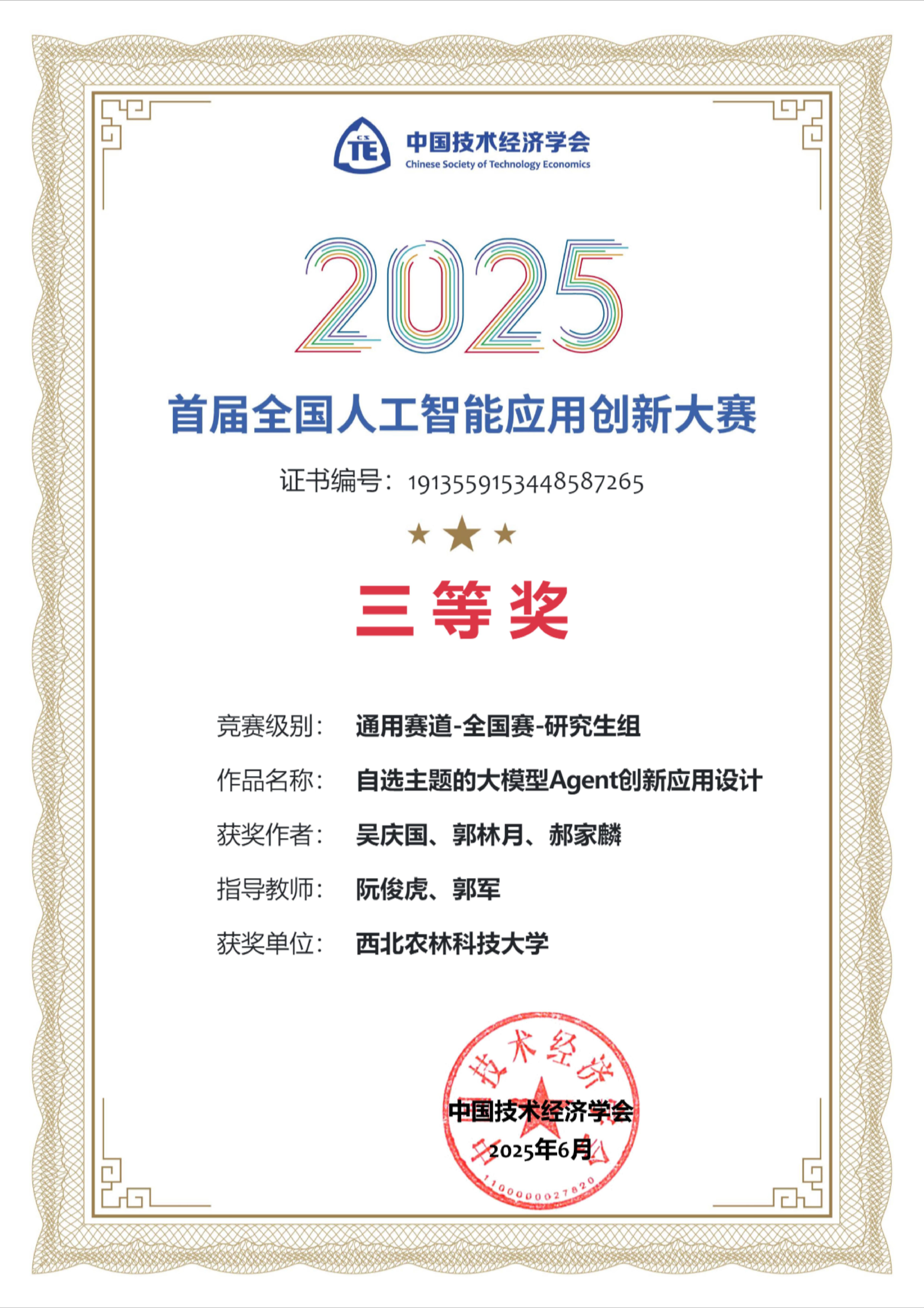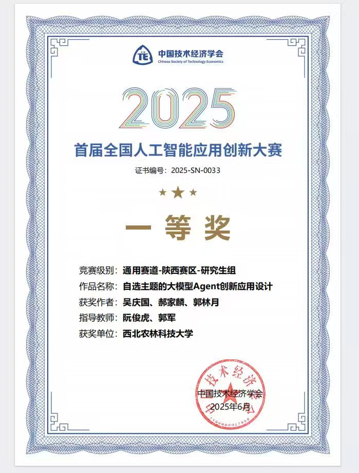 今年6月底,由中国技术经济学会主办的2025首届全国人工智能应用创新大赛圆满落幕。太阳成集团tyc9728阮俊虎教授与植物保护学院郭军教授共同指导的研究生团队(队长:吴庆国,队员:郝家麟、郭林月),凭借《后稷农业大模型·御锈》项目,在激烈竞争中脱颖而出,一举斩获通用赛道研究生组陕西省一等奖与全国总决赛三等奖,彰显了团队在人工智能应用领域的探索能力与创新水平。