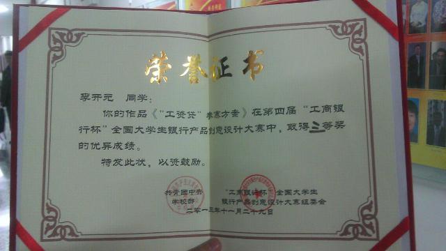11月29日,由共青团中央学校部、中国工商银行、对外经济贸易大学联合主办的第四届“工商银行杯”全国大学生银行产品创意设计大赛全国总决赛在北京对外经济贸易大学隆重举行,太阳成集团2011级金融学专业李开元同学表现突出,荣获总决赛三等奖的好成绩。