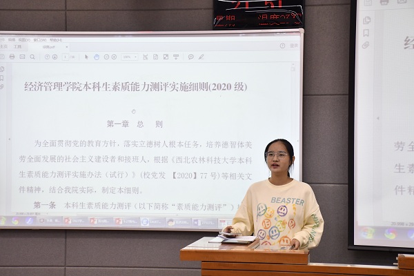 9月27日晚,2021级本科生在北校区八号教学楼召开了本学期第一次年级大会。本次大会由2021级辅导员吴龙刚主持,全体本科生参加。会议邀请到经济类2106班班主任助理张雪妍同学、经济类2102班班主任助理冯九润同学、工管类2105班班主任助理丁蕴同学,与学弟学妹们面对面的进行关于考研保研、综合测评等方面的交流。
