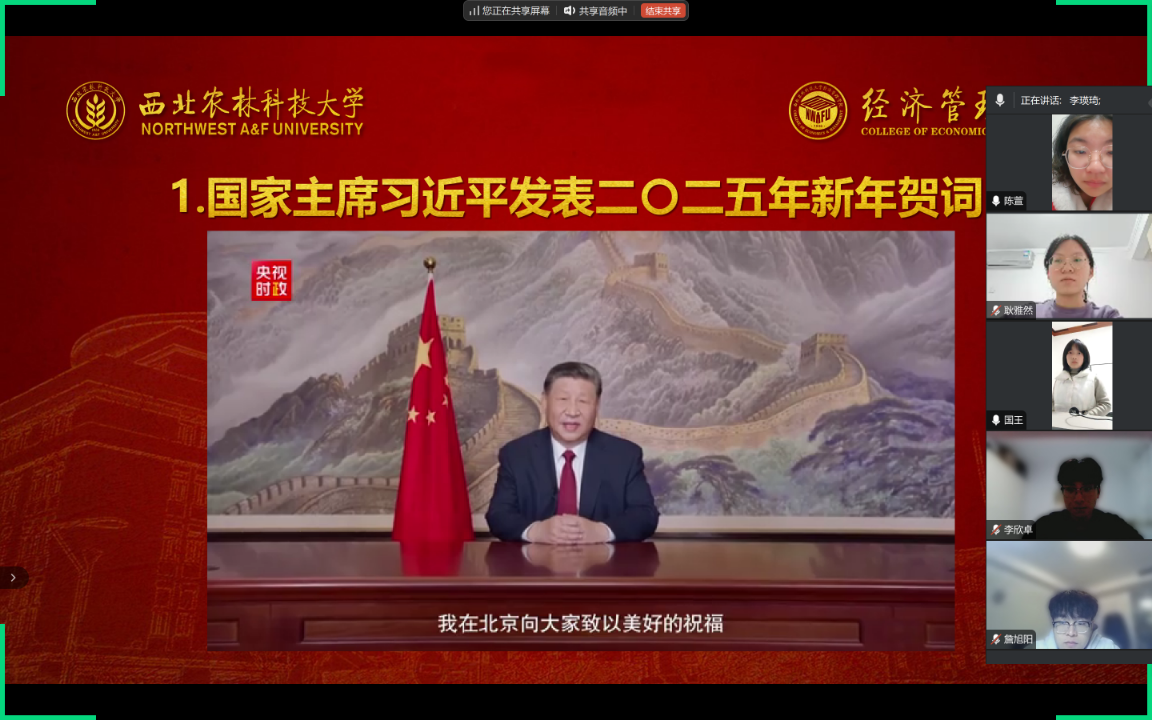 本次学习活动由团委学生副书记袁春雪主持,并围绕“蛇年新程,共启新篇”主题开展专题政治理论学习。会议伊始,全体团学干部集体观看了国家主席习近平发表的2025年新年贺词。袁春雪结合习近平总书记的贺词,对新时代青年所肩负的责任和使命进行了解读。随后,同学们共同学习了学校党委书记黄思光、校长吴普特发表的西北农林科技大学2025年新年贺词,深刻领悟新年寄语。