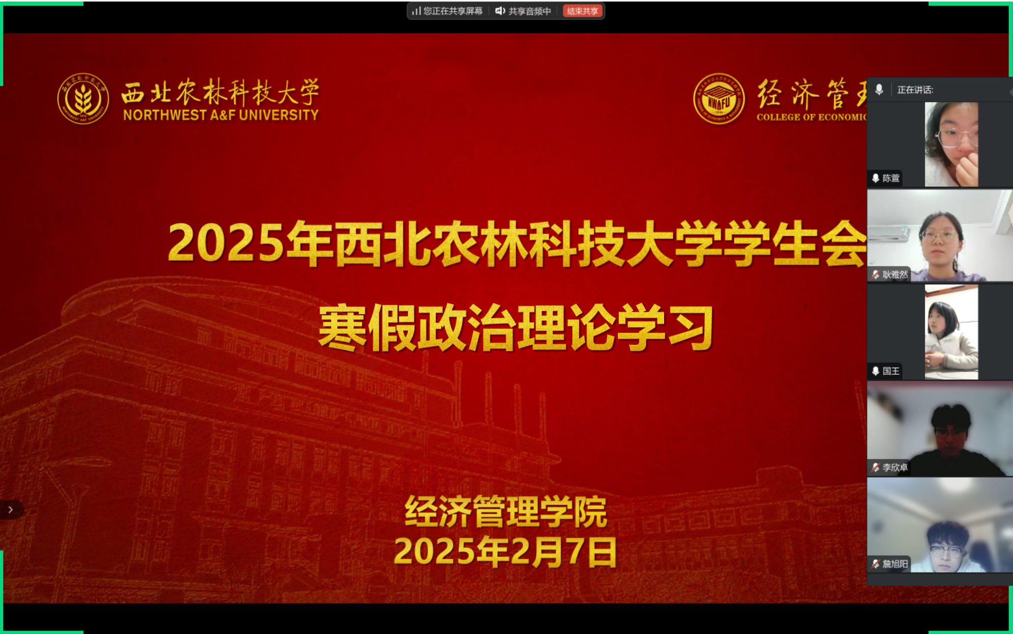 为深入学习贯彻习近平新时代中国特色社会主义思想,进一步提升学院学生会骨干的政治理论素养和综合能力,学院团委学生会于2月7日晚在线上开展了“2025年寒假政治理论学习”活动,团委学生会全体学生干部积极参会。