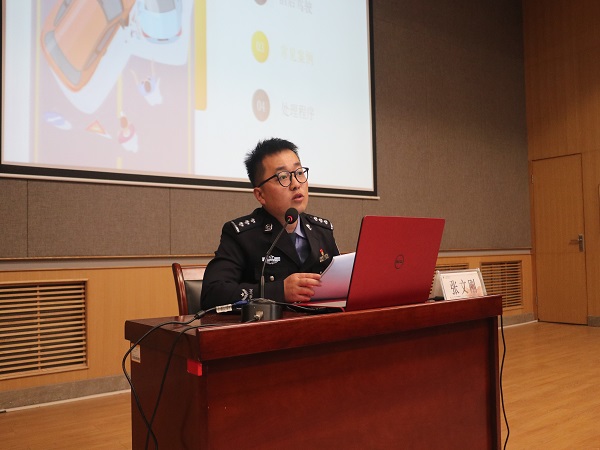 校园内电动车越来越普及,但电动车安全与规范出行的问题依旧是我们需要关注和重视的。宣讲过程中,张文刚警官对电动自行车、电动摩托车的安全行驶问题,小到电动车头盔的佩戴方式、电动车挂牌照的具体流程,大到电动车出行规范、马路上的安全隐患,进行了系统专业的讲解。警官给大家播放了电动车挂牌照具体流程及出行规范的讲解视频,结合视频内容即时对具体细节进行补充讲解。报告会过程中,张文刚警官以淳朴的陕西方言拉近了与同学们的距离,并时不时与同学们进行内容互动与交流,让同学们在轻松愉悦的氛围中学习安全知识,并加深对出行安全和规范交通的认识与理解。