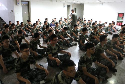 34连的军官和学生布满了整个楼道和大厅。虽然外边下着倾盆大雨,但却浇不灭34连一颗坚持军训的心,谁都没有打一声报告,叫一个苦字。160双眼睛注视着军官的教学动作,领悟着其中的难点和要领。猛然间我想起了去年我们参加的军训,想起了我们不畏酷暑和风雨坚持训练的时光。军训的时光总是让人怀念,过去的苦和痛到今天,回忆起来都是满满的甘甜,感激与怀念洋溢于心间。