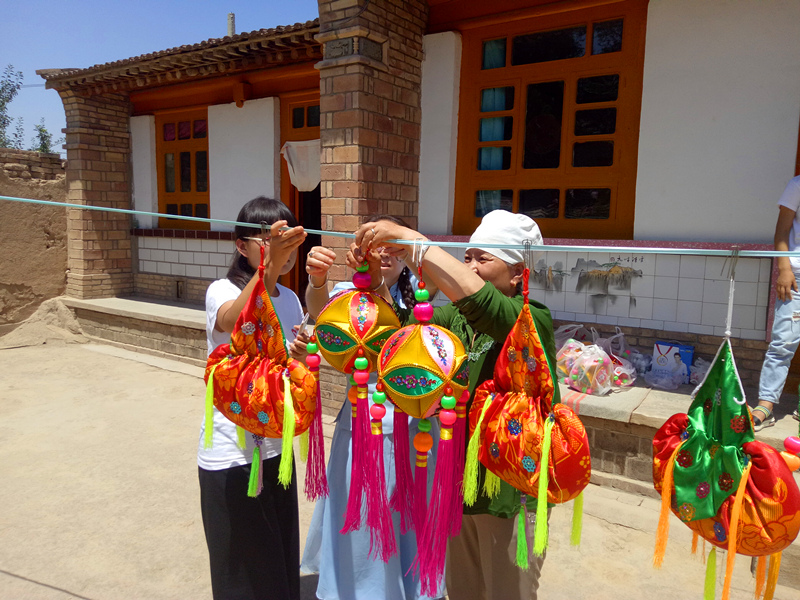 7月12日早,经管学院赴会宁文化艺术考察团前往会宁县新堡子村,拜访一位民间手工艺品制作传承人。一个多小时的颠簸,终于抵达老人家里,老人和她的女儿非常热情,老人表示非常乐意将她的手工艺品和大家分享交流。老人说,她制作绣球、凤凰、荷包等工艺品已经7年时间了。那些被老人视做珍宝的手工艺品,全部被放在一个木柜子里面, 老人一件一件将手工艺品拿出来,边拿边不忘介绍:“这个是凤凰,那个是绣球,是老式的做法,还有另一种绣球,是后来我们又创新的一种做法……”看着一件件绝妙精美的手工艺品,让人不由的称赞。那些被老人一件件挂在绳子上的手工艺品,它们在微风中轻轻摇摆,绣球结构玲珑,荷包散发清香,凤凰展翅欲飞,蝴蝶随风翩翩……