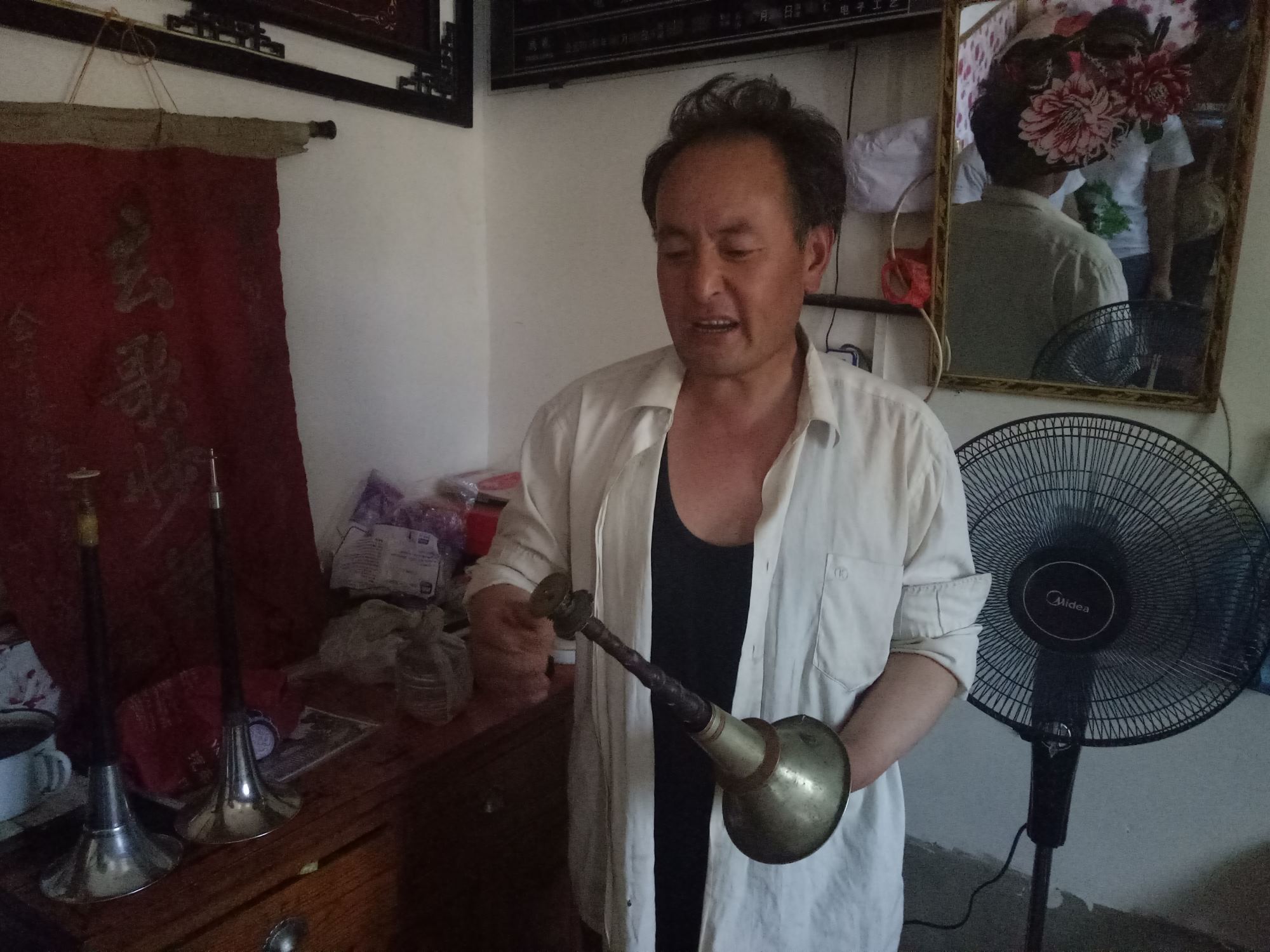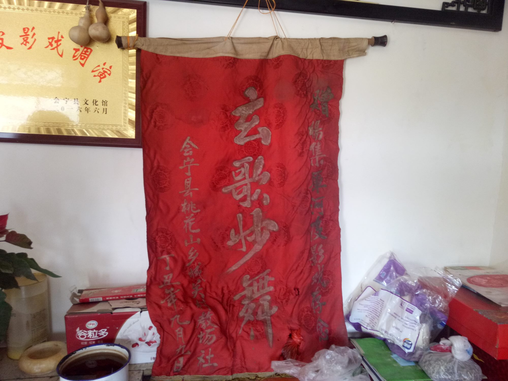 成定余先生的家中的墙上依旧挂着80年代,他的父亲进行皮影表演时会宁县文化馆赠与他们的锦旗。