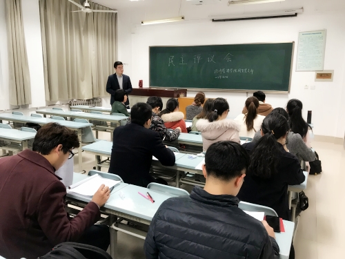 张鹏飞同志首先宣读并解读了院党委《关于召开2017年度基层党支部组织生活会和开展民主评议党员的通知》,同时代表班子通报了党支部班子的查摆问题,支部其他委员也就班子建设查找问题,并积极听取了支部成员与积极分子、考察对象的意见,讨论形成了拟上报院党委的《国贸党支部2017年度基层党支部组织生活会和民主评议党员情况专项报告》与《经管学院国贸党支部学习新党章和党的十九大精神集体学习情况汇报》。