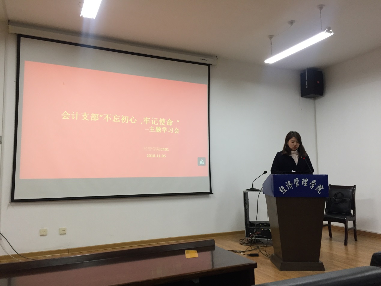 11月5日下午,会计支部于经管学院C401召开本学期“不忘初心,牢记使命”主题学习会暨转正大会,全体党员、预备党员参加此次会议,本次会议由支部副书记苑艺主持。