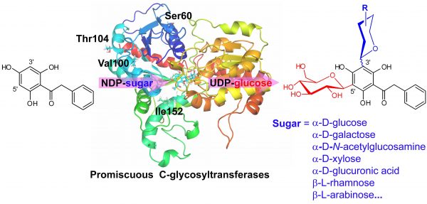 戴均贵教授团队长期致力于药用天然糖苷类化合物的生物合成与药物发现并取得重要研究成果(Angewandte Chemie International Edition, 2015, 54, 12678-12684 ; Advanced Syn- thesis & Catalysis, 2017, 359, 603-608)。在进一步研究中他们从芒果叶中挖掘到一个能够催化bis-C-糖基化的C-糖基转移酶,发现其152位氨基酸是催化bis-C-糖基化反应的关键位点,且60/100/104位氨基酸与bis-C-糖基化反应的活性相关。通过对上述4个活性位点进行理性设计,得到一系列具有不同催化功能的突变体酶,如MiCGT-E152L具有宽泛的糖基受体底物谱,MiCGTb-GANM等能够接受不同结构的α-D-和β-L-糖基供体。这是目前报道的底物及反应杂泛性最强的bis-C-糖基转移酶。该研究不仅揭示了C-糖基转移酶催化bis-C-糖基化反应的关键活性位点,阐释了bis-C-糖基化的催化机制,而且通过人工设计改造构建了具体不同催化功能的C-糖基转移酶库,为活性糖苷类化合物的生物合成提供了新策略。后续研究发现其中一突变体酶MiCGTb-GAGM具有催化不同结构香豆素类化合物合成香豆素C-糖苷类活性分子(Or-ganic Letters, 2018, 20, 1634-1637)。