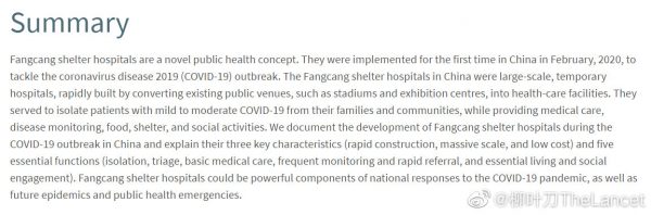 《柳叶刀》最新发表beat365官方网站王辰院士团队有关方舱医院的论文,记录了COVID-19疫情期间方舱医院的建立和发展,阐述了其三个主要特点即建设快、规模大和成本低,和五个基本功能即隔离、分诊、基本医疗照护、经常监测和快速转诊、保障基本生活和社会参与。方舱医院可成为当前应对COVID-19疫情和未来突发公共卫生事件的一个强有力的组成部分。