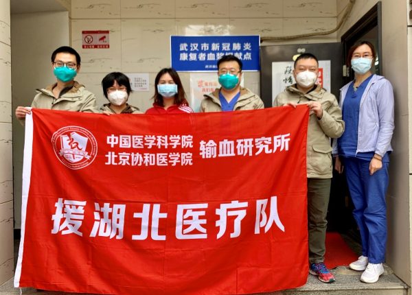 6名队员在武汉市新冠肺炎康复者血浆捐献点合影,